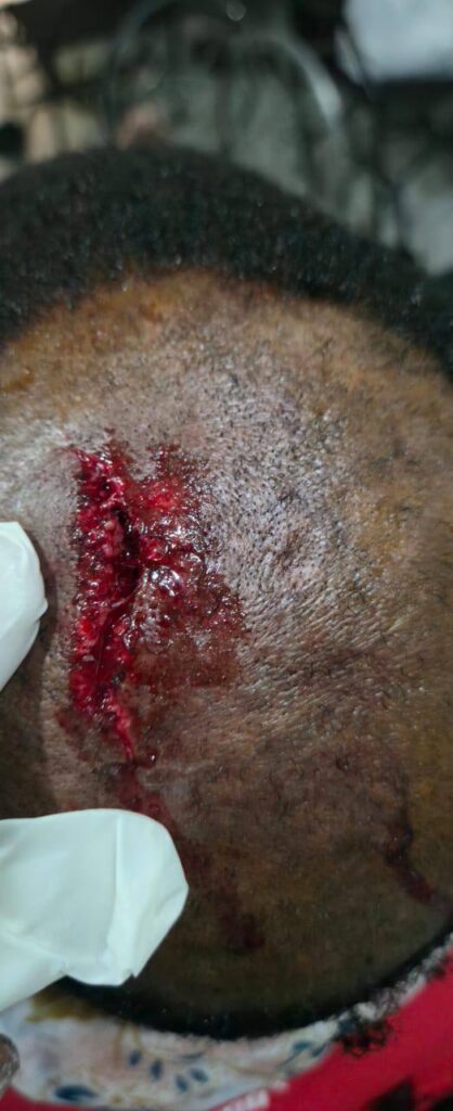 Ci-dessus, Le crane ouvert de l’activiste et à droite , l’agresseur sénégalais avec son arme accrochée à la poche de son pantalon