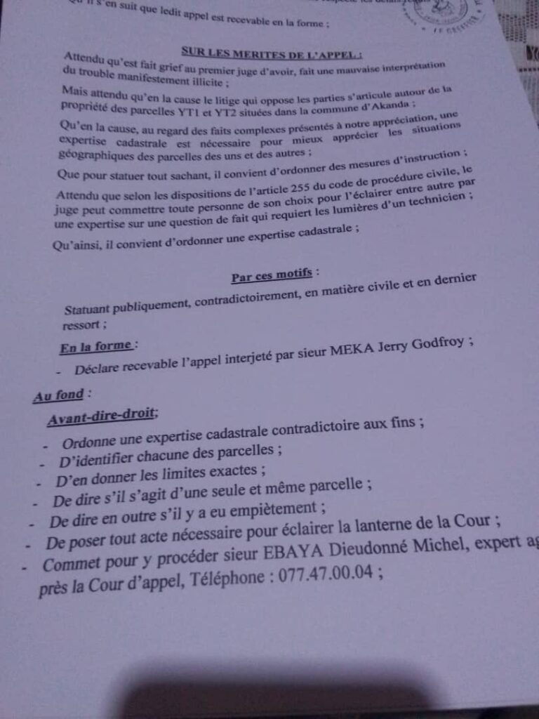 Le 30 avril 2025, la Cour d’appel ordonne une nouvelle expertise. Notification faite, expert désigné. Que fait-elle ? Elle refuse de se présenter et continue à poser des actes de vente sur le terrain, en violation flagrante de la loi.