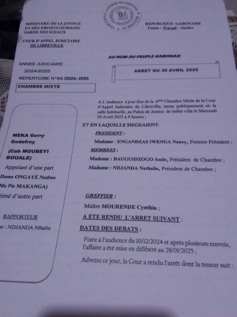 Ci-dessus, les copies des documents du tribunal dont madame Ongaye s’est moquée pour revenir sur le terrain litigieux. Pour elle, le chef de l’État serait son parent. C’est du moins ce qu’elle clame haut et fort, selon les populations à qui elle a arraché des terrains.