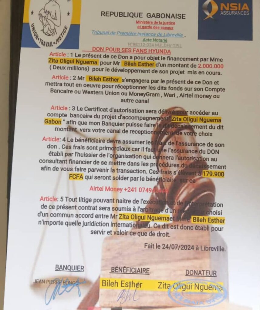 Un acte notarié falsifié, daté du 24 juillet 2024, prétend qu’un don aurait été effectué par Mme Zita Oligui Nguema au profit d’un certain Bileh Esther. Ce document abject n’est rien de moins qu’un mensonge éhonté, une tentative pathétique de tirer profit de la réputation et de la générosité de la Première Dame. Mme Zita Oligui Nguema dément formellement avoir eu le moindre contact avec cet individu et déclare n’avoir aucun lien avec cette affaire infâme.