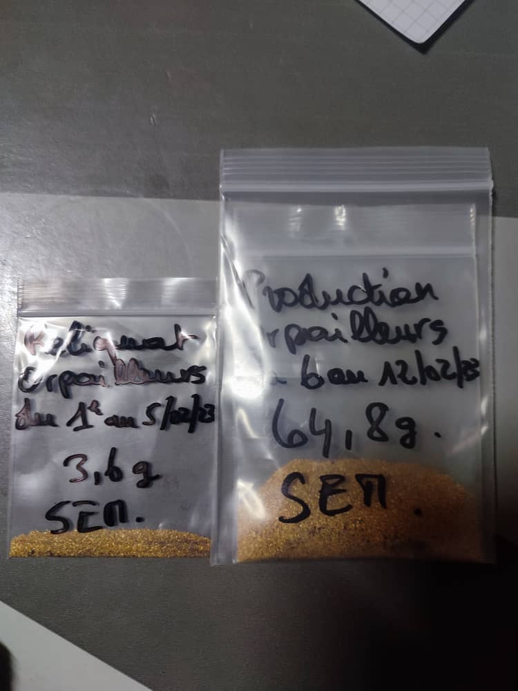 A droite ( petit sachet) la quantité d’or remise à la Direction Générale d’une valeur de 150.000frs CFA