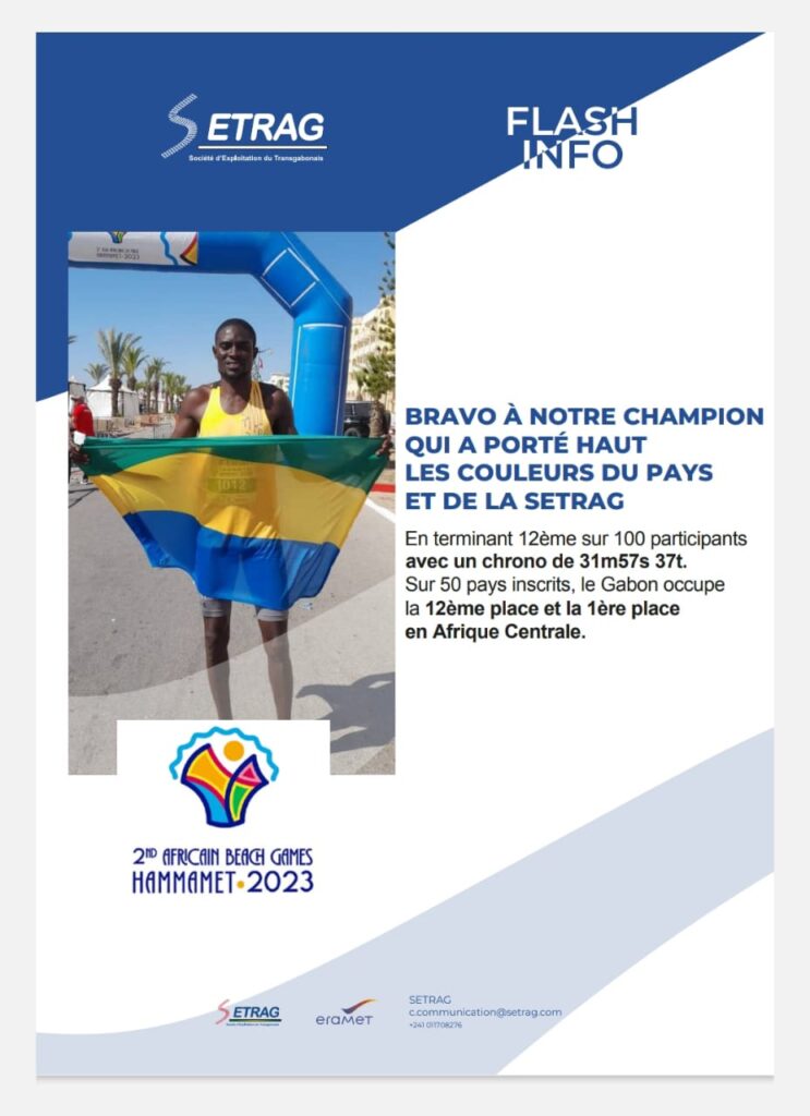 L’athlète gabonais Djessy MouléKodo a fait honneur à son pays lors des 2èmes Jeux africains de Plage qui se sont déroulés à Hammamet, en Tunisie. Soutenu par Eramet via la Setrag, MouléKodo a participé au marathon de plage, où il a obtenu une impressionnante 12ème place parmi les 100 athlètes participants. Grâce à cette performance, il devient le premier athlète d’Afrique Centrale dans cette compétition. Sa participation a été rendue possible grâce à l’intervention du Comité Olympique Gabonais, et cette réussite fait suite à sa victoire lors du Marathon de Port-Gentil organisé par Perenco. Les Jeux africains de Plage ont réuni des participants de 53 pays de l’ACNOA, et MouléKodo a fait briller les couleurs du Gabon face à une concurrence intense dans cette compétition de renommée continentale.
