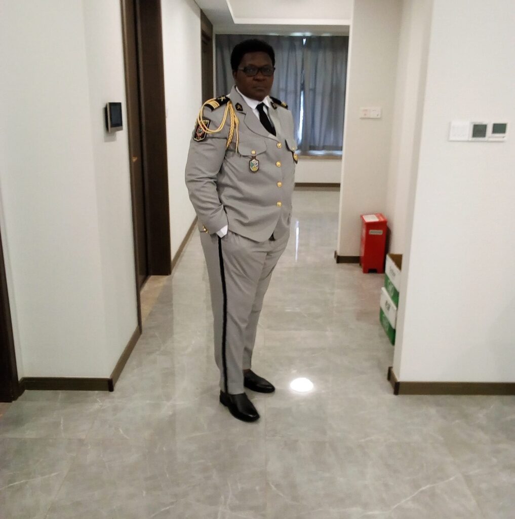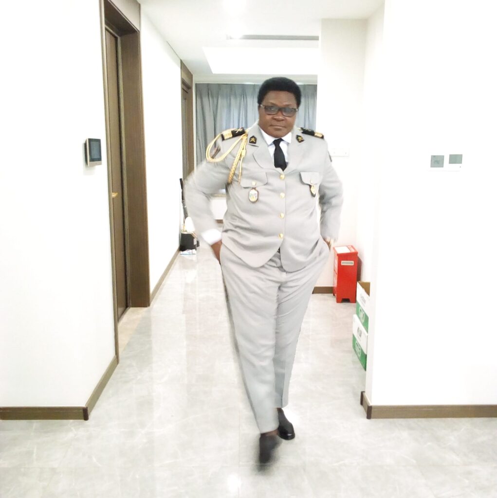 Mélanie Engoang, à côté de ses nombreuses récompenses, et à droite, en tenue de commandant dans l’armée gabonaise.