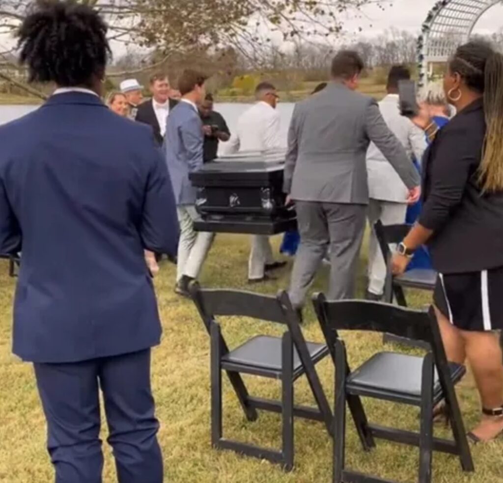 Un homme courageux a eu l’idée originale de débarquer à son mariage couché dans un cerceuil d’une valeur de 4000 dollars (2.6 millions de FCFA) porté par l’avant par deux demoiselles d’honneur suivis d’autres garçons d’honneur.