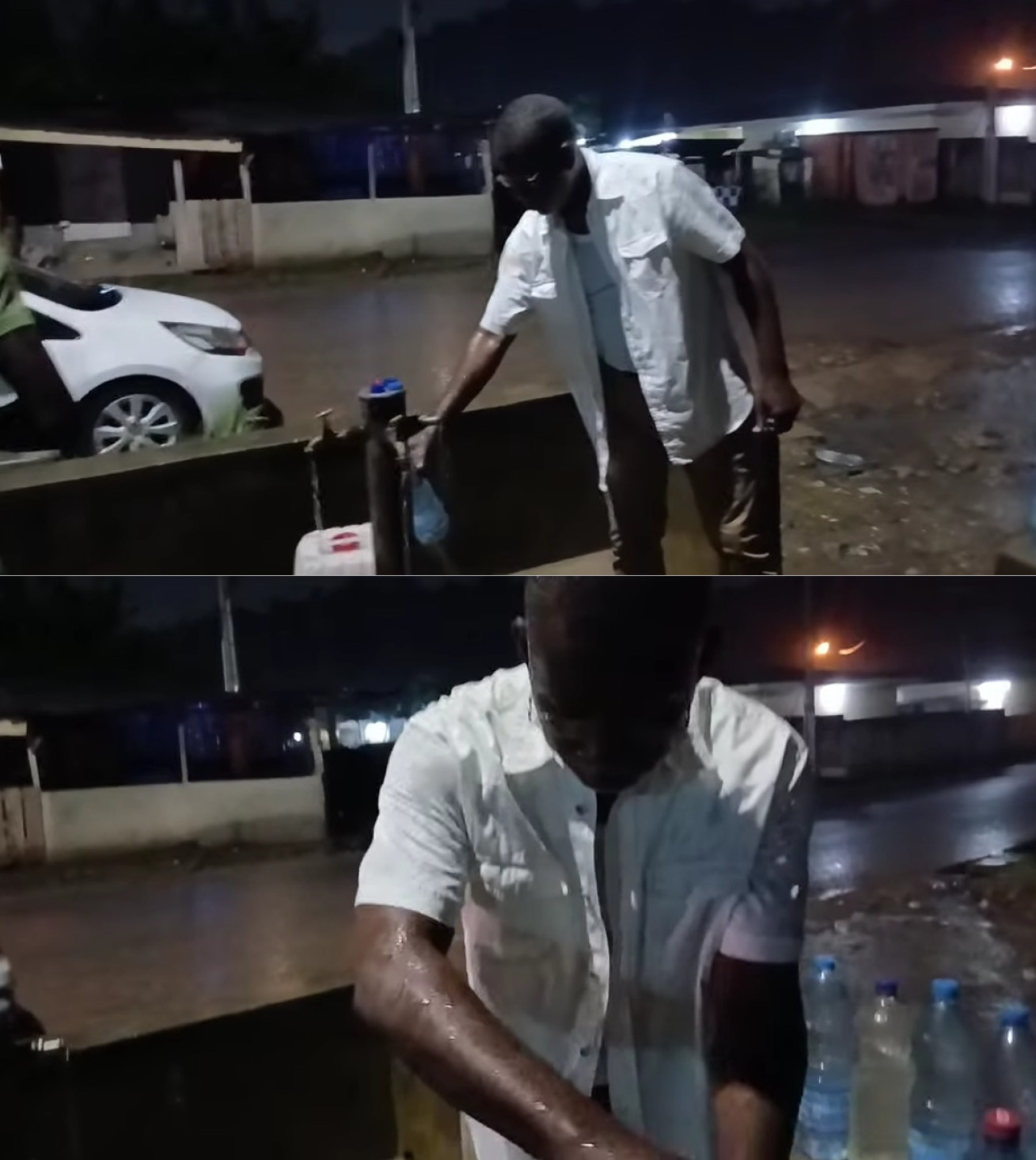 Ci-dessus, Paskal Nkoulou , conseiller du chef de l’Etat , sous la pluie remplissant ses bidons d’eau dans une pompe publique