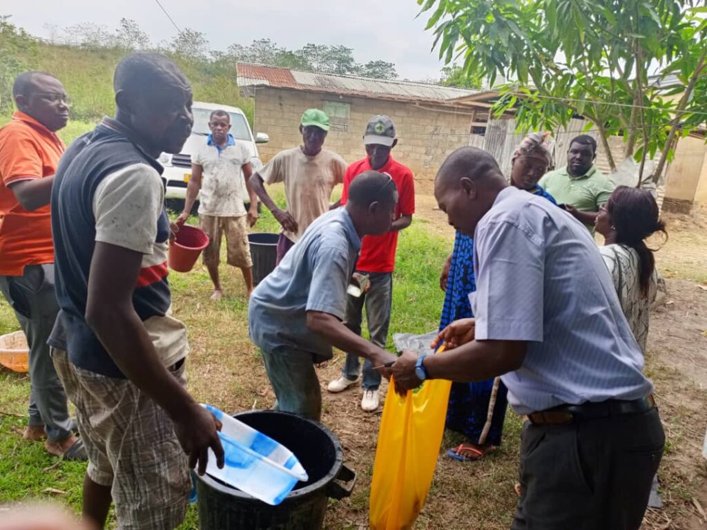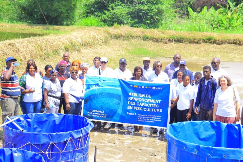 Ci-dessous , La formation sur les techniques de pratiques de l’aquaculture hors-sol aux femmes et aux jeunes de Tchibanga
