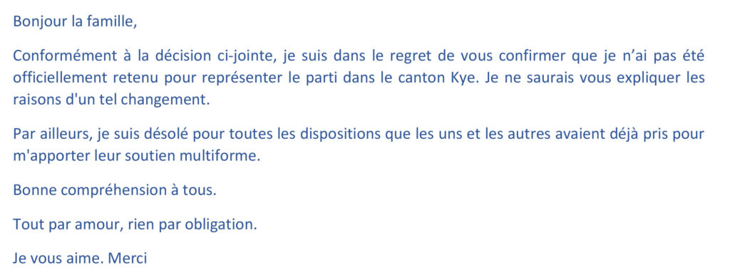 Dans un paysage politique souvent marqué par les rancœurs et les règlements de comptes, cette posture force le respect. Elle rappelle que, pour certains, militer ne consiste pas à se servir, mais à servir, même quand l’institution à laquelle on a tout donné vous demande de vous effacer.