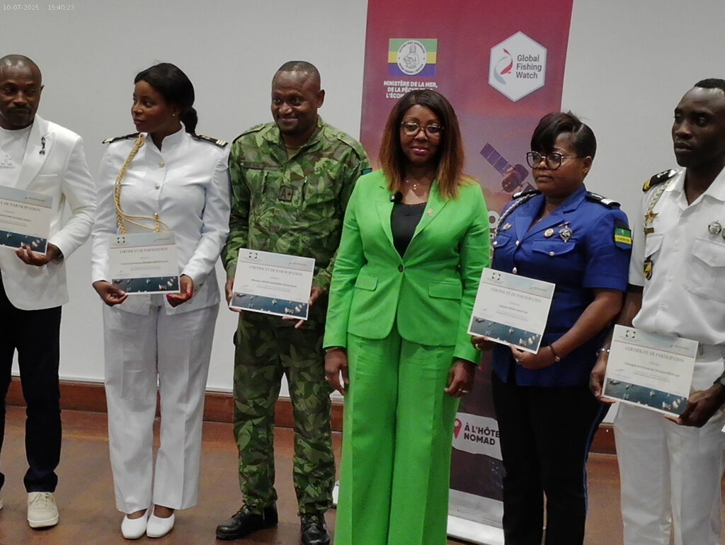 Le Gabon a désormais les yeux rivés sur ses mers… depuis l’espace. Après trois jours d’échanges, de démonstrations et de formation, l’Atelier national de concertation et de formation sur l’utilisation des outils de Global Fishing Watch s’est achevé ce mercredi à Libreville, sous la présidence de Madame Laurence NDONG, Ministre de la Mer, de la Pêche et de l’Économie bleue, également porte-parole du Gouvernement. Cet atelier, organisé du 7 au 9 octobre 2025, a réuni une cinquantaine de participants venus de divers horizons : experts, techniciens, officiers de la Marine nationale, gendarmes nautiques et représentants d’administrations partenaires. L’objectif était clair : apprendre à mieux surveiller les eaux gabonaises grâce à la technologie satellitaire, afin de lutter contre la pêche illégale et renforcer la souveraineté maritime du pays.