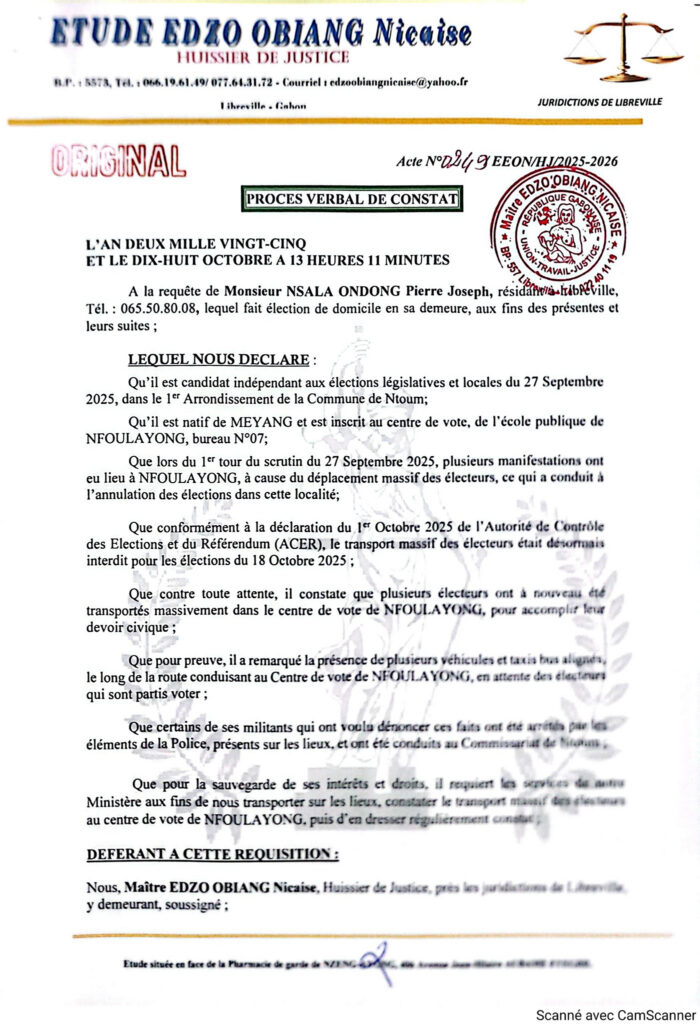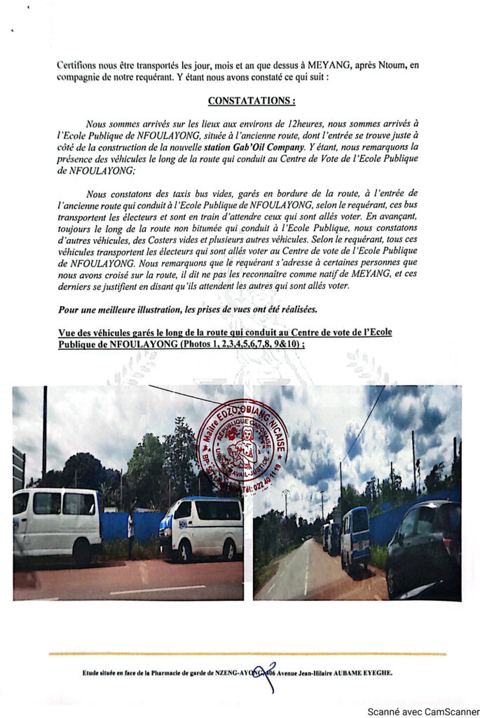 Ci-dessus,Procès-verbal de constat d’huissier démontrant le transport massif d’individus venus d’ailleurs pour voter à Meyang-Nfoulayong
