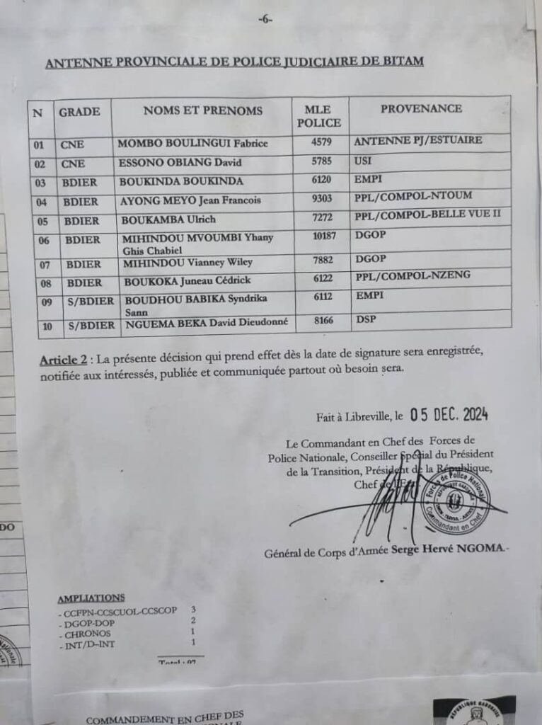 L’inaction des responsables et la passivité supposée du Commandant en Chef face à des documents comportant des erreurs, comme celle de la ville de Bitam mal orthographiée, pourrait refléter un manque de rigueur et d’engagement. Ces erreurs, bien qu’elles puissent sembler mineures, révéleraient une gestion préoccupante et affecteraient l’image de l’institution. Si, au lieu de corriger ces dérives, l’incompétence était récompensée, cela pourrait avoir des conséquences graves. La situation pourrait être intolérable pour de nombreux policiers et mériterait une attention immédiate.