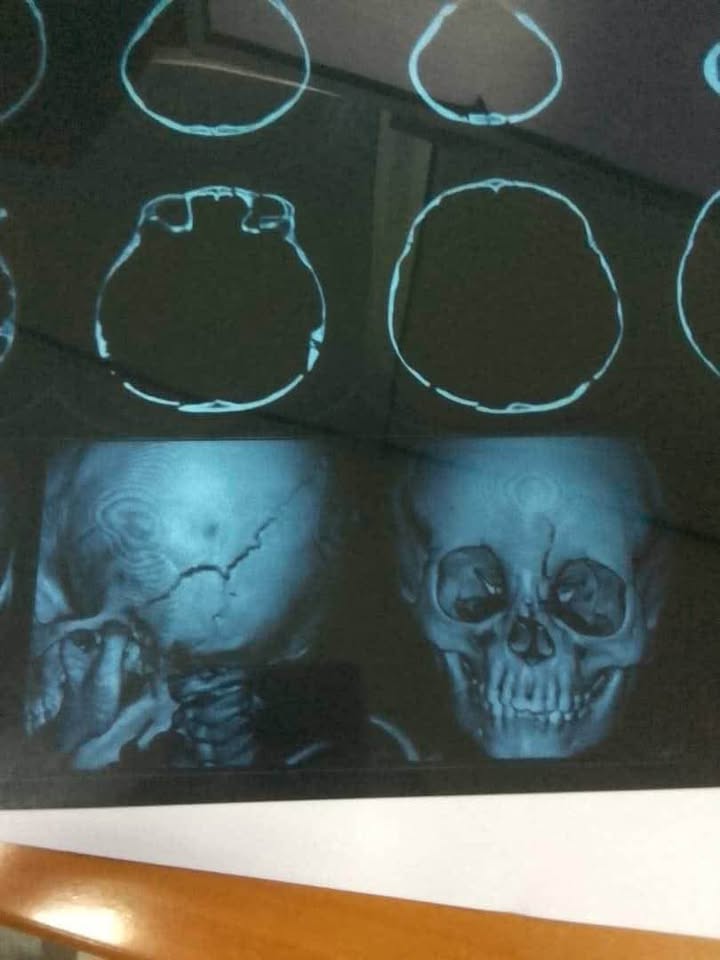 Ci-dessus , fracture du crâne, œil gravement atteint, perte de connaissance… Le pronostic vital de la petite fille est engagé.