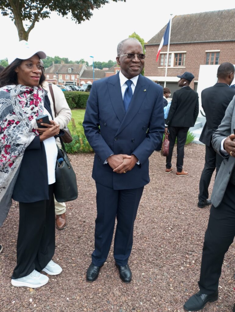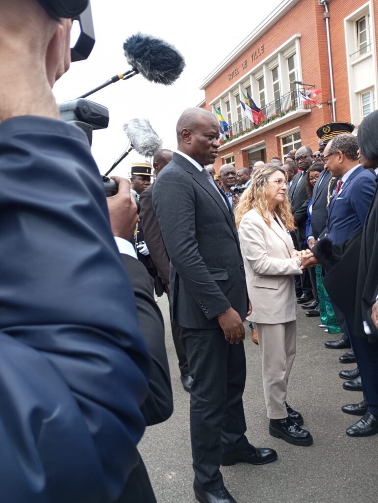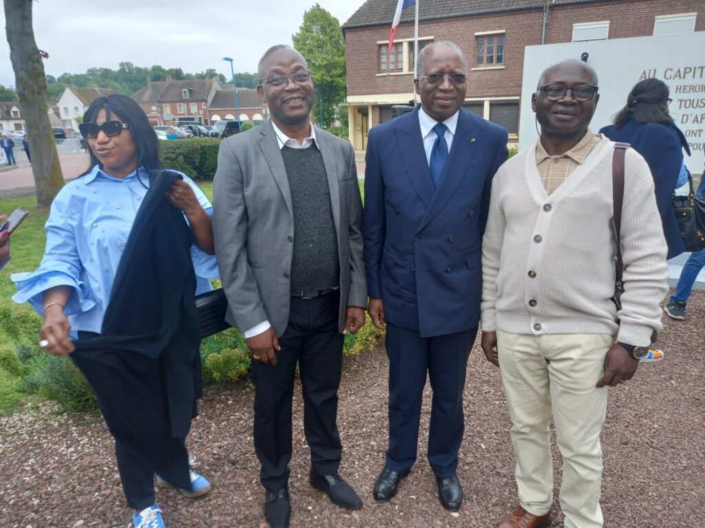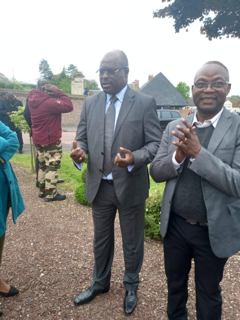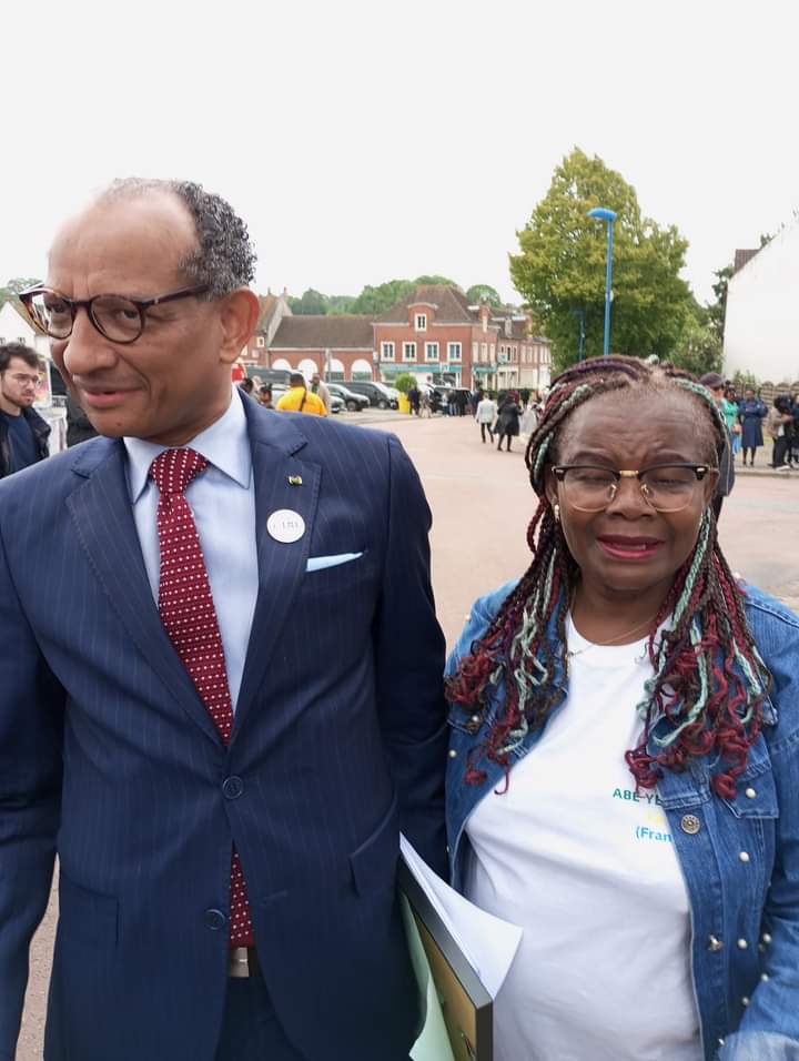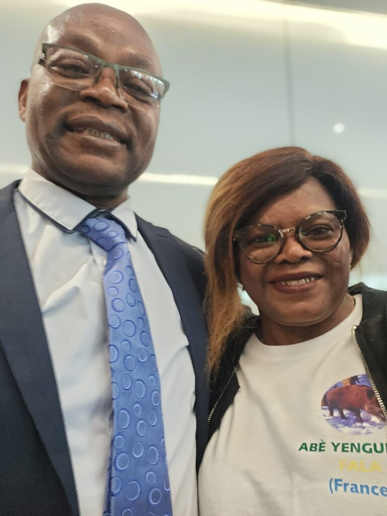 Ci-dessous, à gauche, M. Jean Baptiste Obiang Obame, Président de l’Association Abè Yenguingne Ya Fala ; à droite, Mme Durence Abogo Bikoro, Vice-Présidente de ladite association. Plus bas, quelques membres de l’association posent aux côtés de membres de la délégation présidentielle, à l’occasion d’un voyage officiel du Chef de l’État en France.