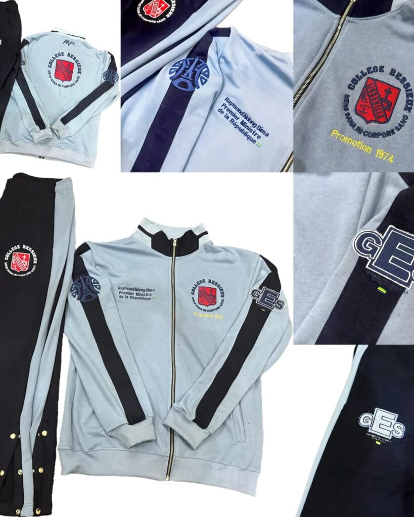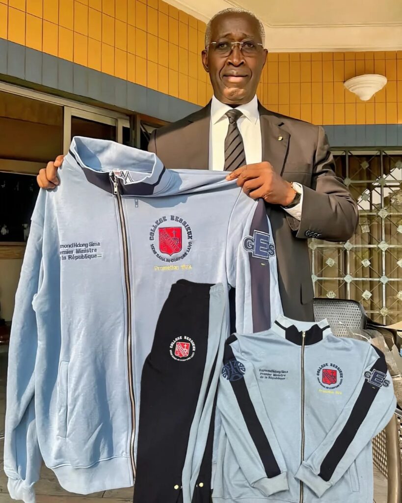 Le Premier ministre Ndong Sima Raymond dévoile avec fierté la tenue de sport aux emblèmes de son ancien établissement secondaire, un cadeau offert par le créateur Harold Ndong Mezui