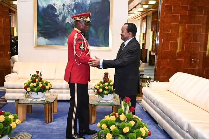 Le président Gabonais en tenue militaire reçu par son homologue camerounais au palais présidentiel