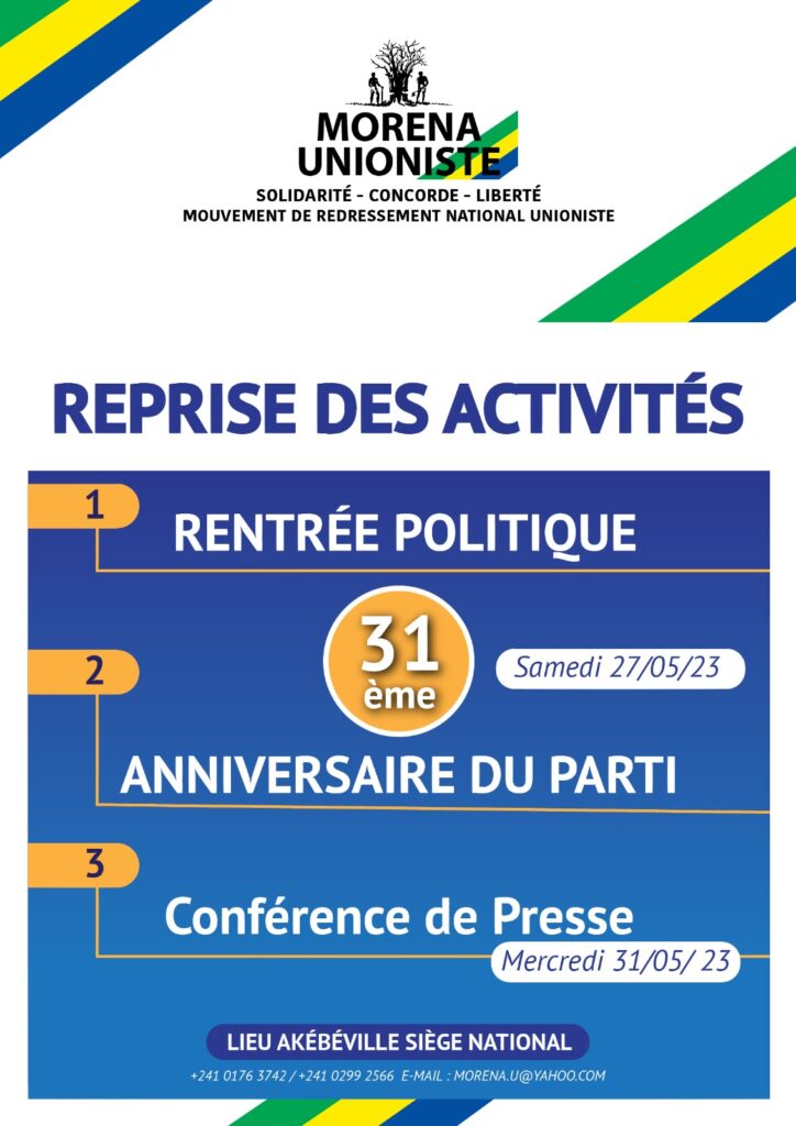 À cette occasion, le parti politique fera sa rentrée politique du 27 au 31 mai, marquant également les festivités de son 31e anniversaire. Une conférence de presse se tiendra le 31 mai 2023 à 14 heures, au siège du parti à Akebe.