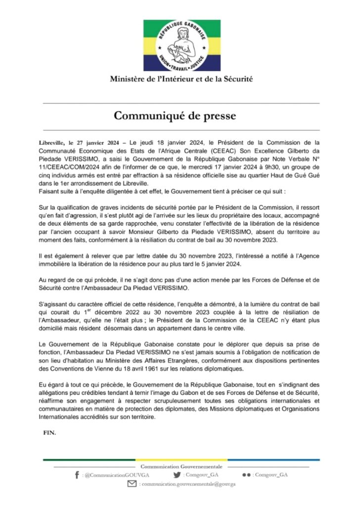 Dans un récit qui suscite la controverse, le Général Gilberto da Piedade Verissimo, président de la Commission de la Communauté économique des États de l’Afrique centrale (CEEAC), est accusé d’avoir délibérément diffusé de fausses informations au sujet d’une prétendue intrusion armée à son domicile de Libreville. Cependant, des documents officiels et des informations récentes semblent contredire ses déclarations, soulevant ainsi des questions sur la véracité de ses propos et sur sa probité morale.
