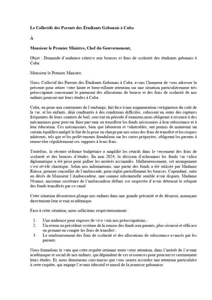 Ci-dessous , la demande d’audience du collectif des parents des étudiants gabonais à Cuba au 1er ministre , chef du gouvernement