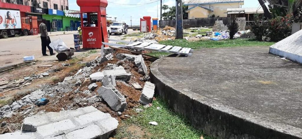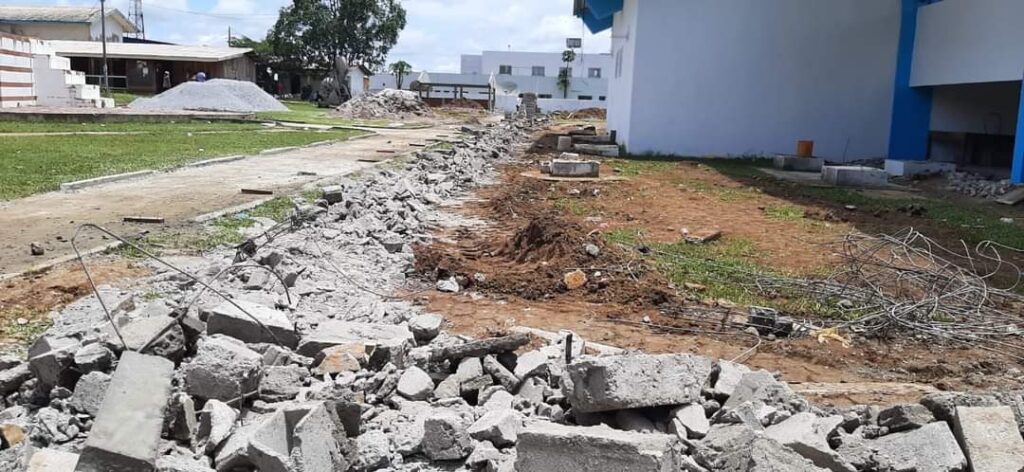 En bas, arret et destruction totale des fondations devant porter les bâtiments en vue de rendre moderne et attrayante la place Nkoum Ekieng à Oyem : plus de 70 millions en l’air et de nombreux jeunes de nouveau au chômage.